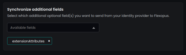 Flexopus supports up to ten additional attributes synchronized from external sources. They are called extensionAttribute1, extensionAttribute2, …, extensionAttribute10 in Flexopus.