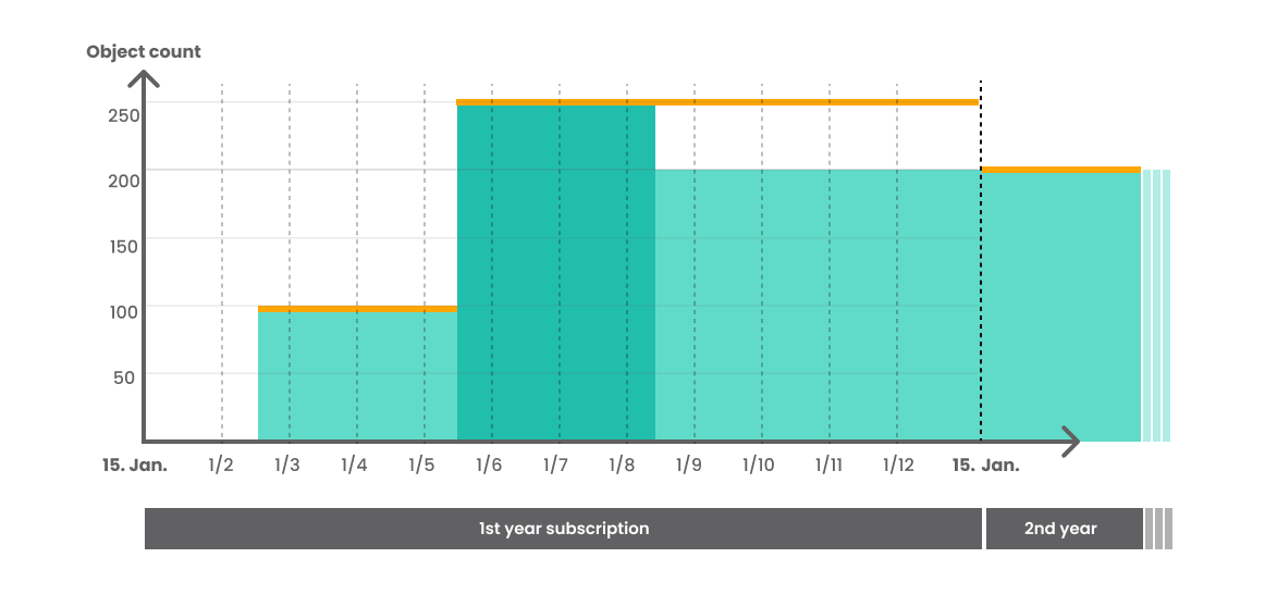 The resource-based licenses are calculated based on the number of resources you use and need to be paid proportionally until the end of the year in advance for the remaining time of your subscription. You start with0 resourcesand you can increase it during the year at any time. Decreasing the resources from the current maximum will affect the resource count at the renewal.
