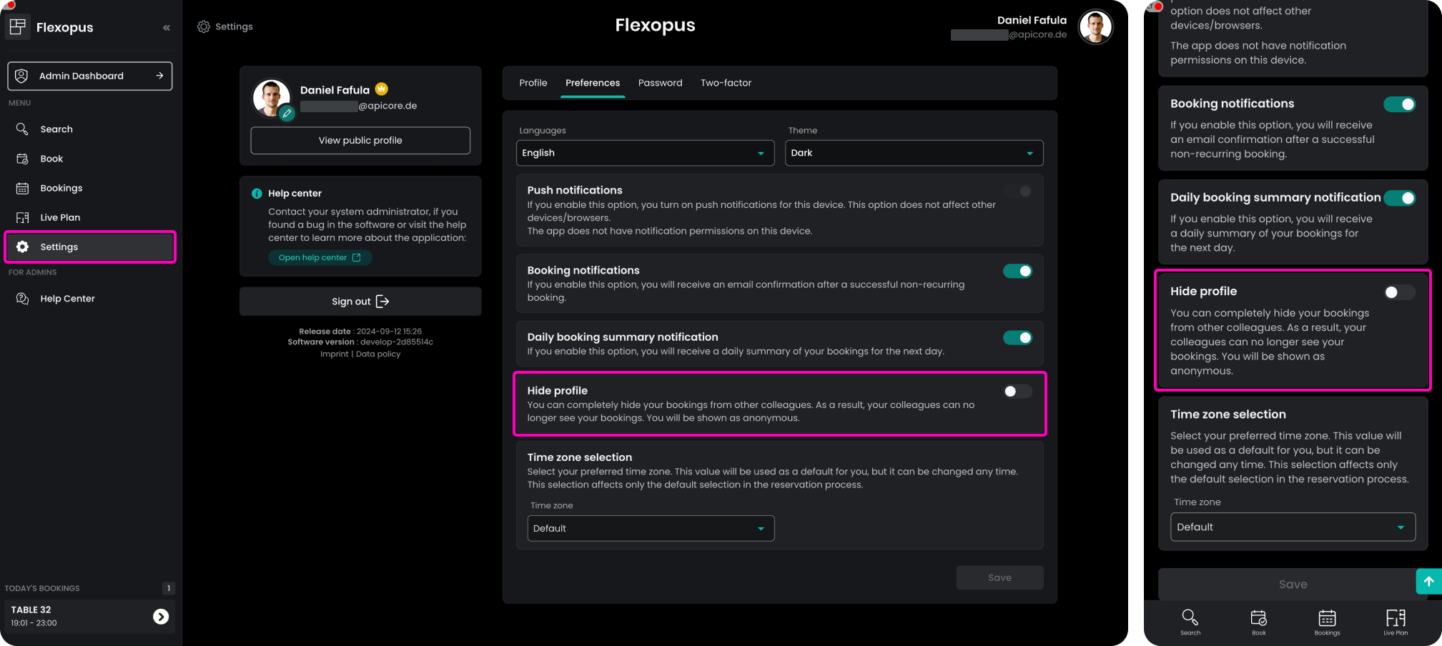 Still, in some cases, HR or the work council decides to limit this setting and make it possible for users to hide their bookings and their presence in the office.In case you can decide about the visibility of your profile due to the global privacy settings configured by the administrators, you can find the setting in the profile settings > preferences tab called hide profile.