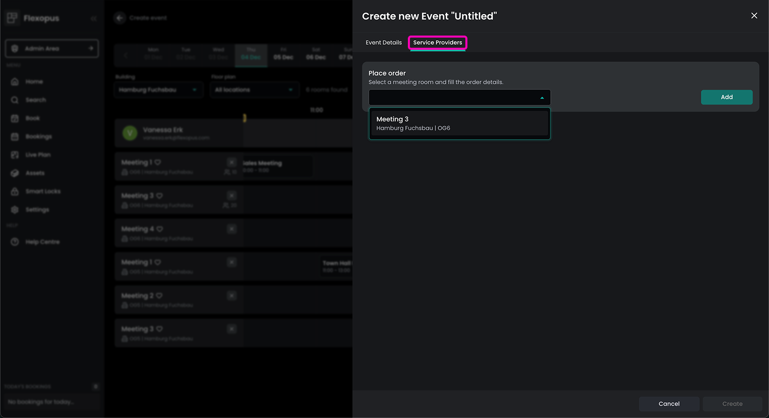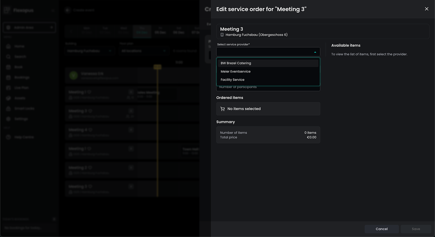 If you are also using our Catering & Services feature, you have the option to immediately attach a service order to your event. This could be, for example, instructing the facility manager to arrange the seating in a certain way or placing an order with the caterer responsible for providing food for the event.