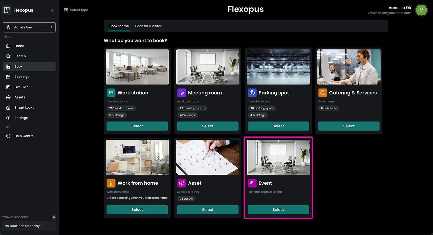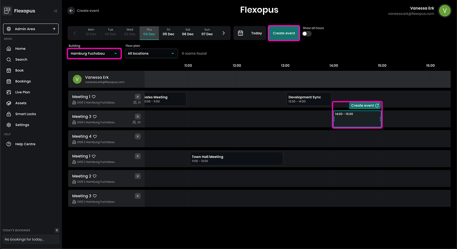 Once you click on it, you are navigated to the event planning overview where you can see all your favorite meeting rooms or you can filter by location. You immediately see the occupancy of those rooms and can directly decide for a room that fits your needs.
