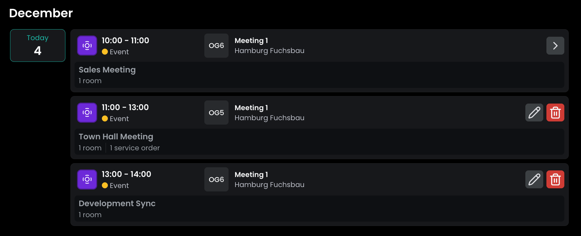 Once all the details for the event have been entered and the event has been created, you will be redirected to your personal booking overview. Here you can see all the events you have created, just as you are used to with your regular resource bookings.