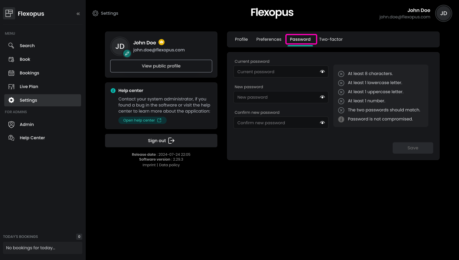 For SSO users! This tab is hidden if your organization is using only Single Sign-On for the authentication. In this case, your password is managed by the external Identity Providers such as Microsoft or Google, and it cannot be changed in Flexopus directly. As a matter of fact, Flexopus does not know your password.