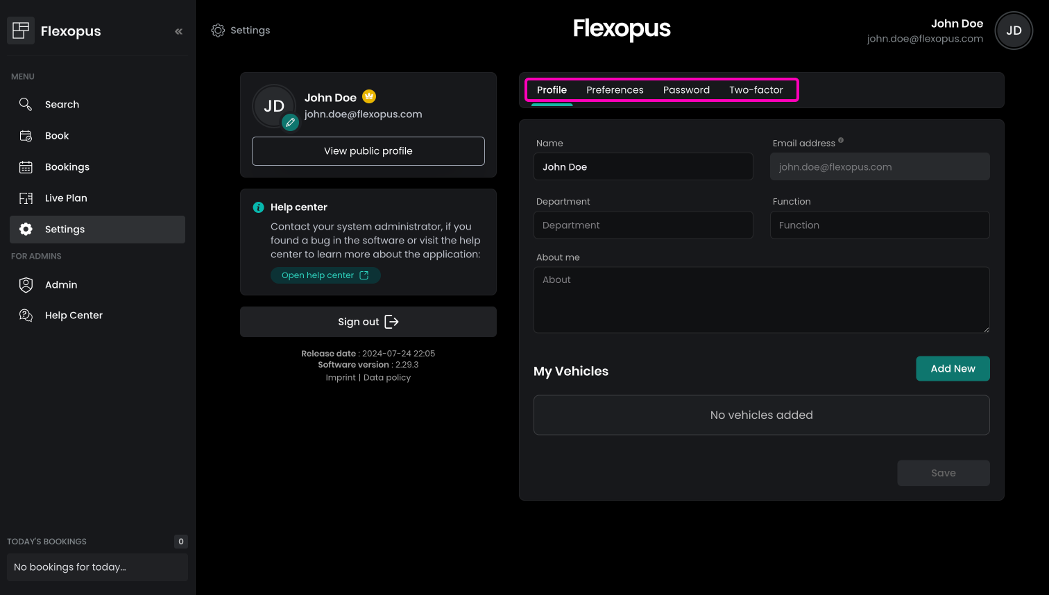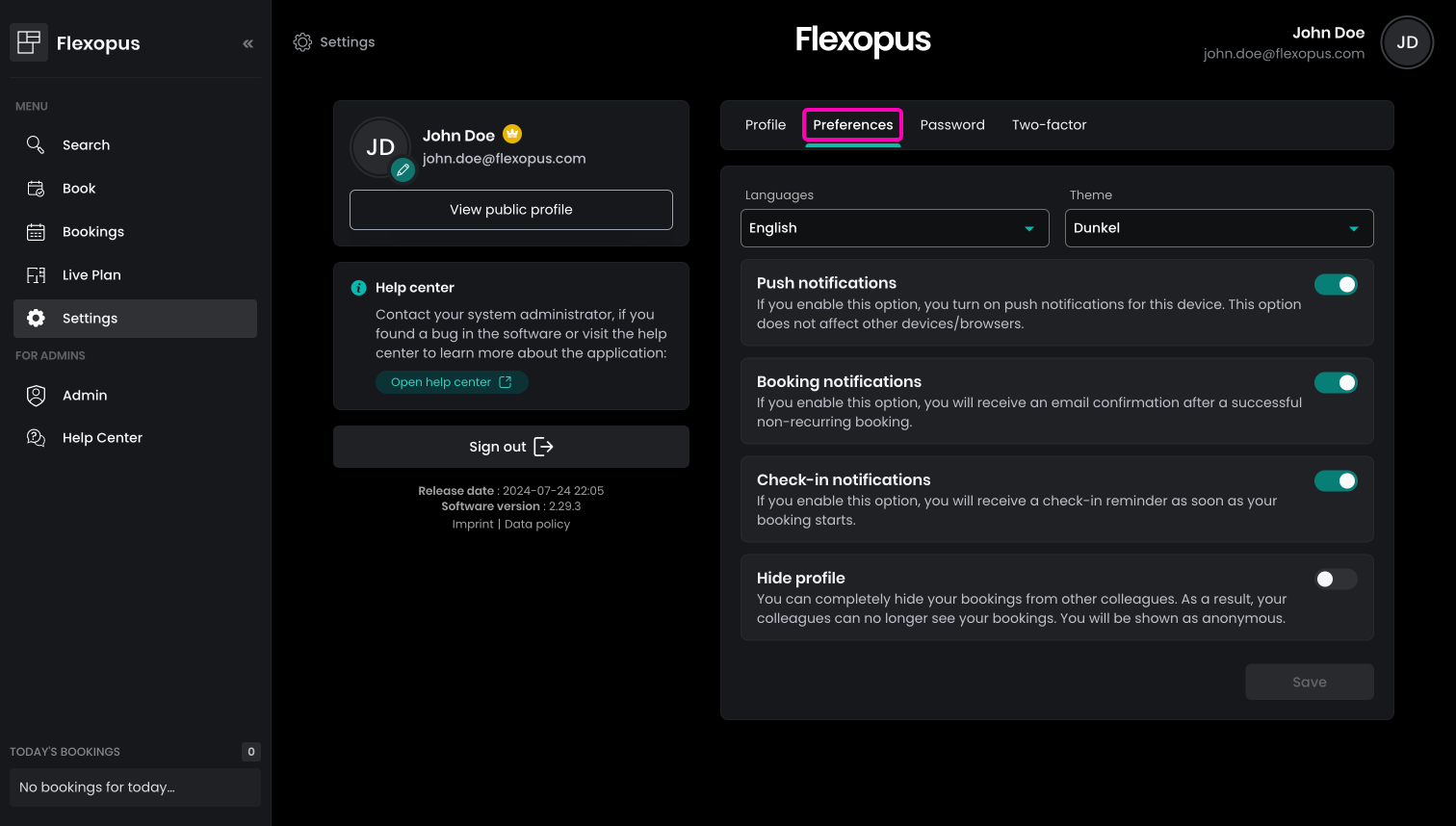 On the preferences, you can find an additional setting called hide profile. This setting is only available if your Flexopus administrators allow you to hide your profile and bookings from other users. It's an optional privacy setting, specific for every organization. If your organization allows deciding individually about their privacy settings, then you can hide your profile from others. Once you activate the function, the other users: