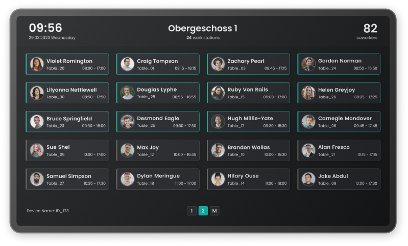 The colleagues with an active reservation today can be displayed on a presence board, to see which colleague is coming to the office today. This is an optional comfort extension to make the people in the office more accessible, by knowing who will be in the building. The same information can also be accessed in the application directly in the live map.