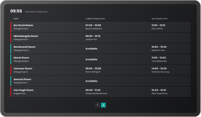 The upcoming reservation of the meeting rooms associated with a floor or a building can be displayed on a meeting room board to easily see which room is free at the moment.